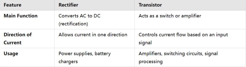 Rectifiers and transistors are both semiconductor devices, but they serve different functions in electronic circuits.